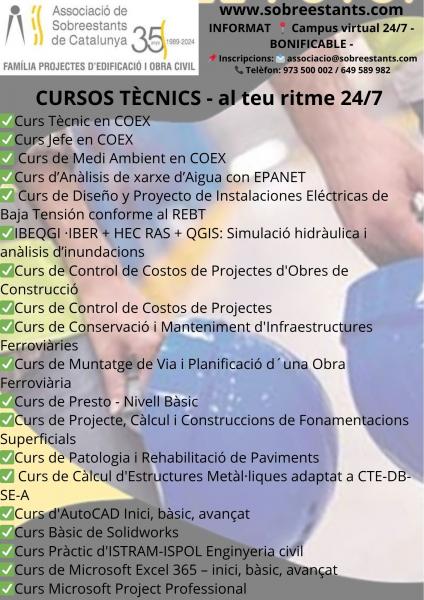 Jornades tècniques: Participació en esdeveniments on es presenten les últimes novetats del sector. Formació contínua tècnica: Més de cinquanta cursos, com BIM, COEX, AutoCAD, GIS i Excel, bonificables al 100% (FUNDAE).
